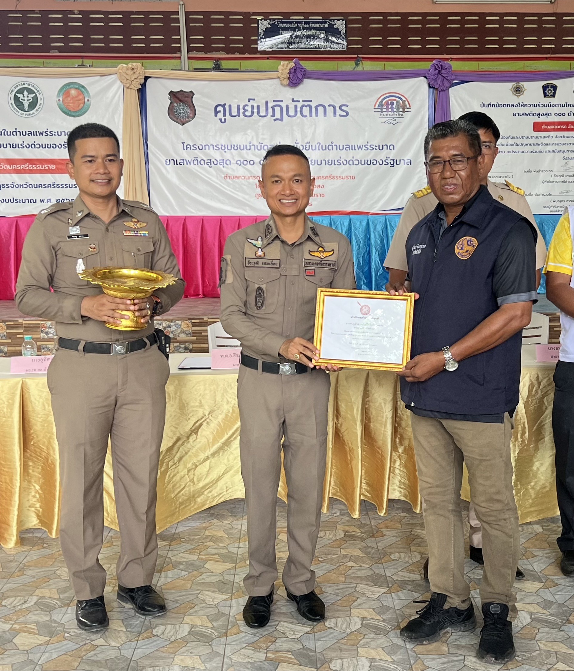 ร่วมพิธีส่งต่อความยั่งยืน และมอบใบประกาศวิชาชีพฯ แก่ผู้กล้าควนกรด ในการดำเนินโครงการชุมชนบำบัดอย่างยั่งยืนในตำบลแพร่ระบาดยาเสพติดสูงสุด 100 ตำบล ตำบลควนกรด