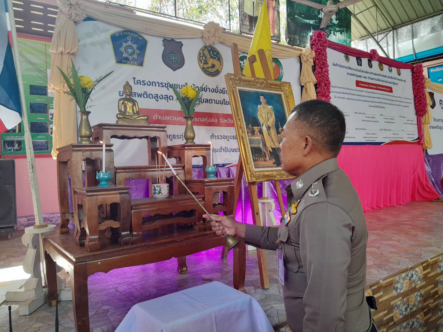 นายขจรเกียรติ. รักพาชินมณี ผู้ว่าราชการจังหวัดนครศรีธรรมราช มอบหมายให้ พล.ต.ต.สมชาย ซื่อต่อตระกูล ผบก.ภ.จว.นครศรีธรรมราช เป็นประธานในพิธีเปิดโครงการ และลงนามบันทึกข้อตกลงตามโครงการชุมชนบำบัดอย่างยั่งยืนในตำบลแพร่ระบาดยาเสพติดสูงสุด 100 ตำบล ณ ศาลาประชาคมบ้านหนองเสม็ด ม.13 ต.ควนกรด อ.ทุ่งสง จ.นครศรีธรรมราช โดยมี พ.ต.อ.นัษฐวุฒิ. ทองทิพย์ รอง ผบก.ภ.จว.นครศรีธรรมราช พ.ต.อ.ธีรวุฒิ เทพเลื่อน ผกก.สภ.ทุ่งสง , นางวิลาวัณย์ จริตงาม ปลัดอำเภอทุ่งสง,นายอดิสันต์ รัตนบุรี ปลัดอำเภอผู้ประสานงานตำบลควนกรดทุ่งสง,นางอมตา จันทร์ปานสาธารณสุขอำเภอทุ่งสง ,ว่าที่ ร.ต.สุรศักดิ์ แก้วเกื้อ นายก อบต.ควนกรด , นายอนันต์ จันทร์เทศ กำนัน ต.ควนกรด ผู้ใหญ่บ้านและผู้ช่วยผู้ใหญ่บ้านทุกหมู่บ้านใน ต.ควนกรด อ.ทุ่งสงพร้อมชุดปฏิบัติการชุมชนยั่งยืนสถานีตำรวจภูธรทุ่งสง อสม. เจ้าหน้าที่ที่เกี่ยวข้อง ให้การต้อนรับและเข้าร่วมรับฟังแผนการดำเนินโครงการชุมชนบำบัดอย่างยั่งยืนในตำบลแพร่ระบาดยาเสพติดสูงสุด 100 ตำบล เป็นไปด้วยความเรียบร้อย