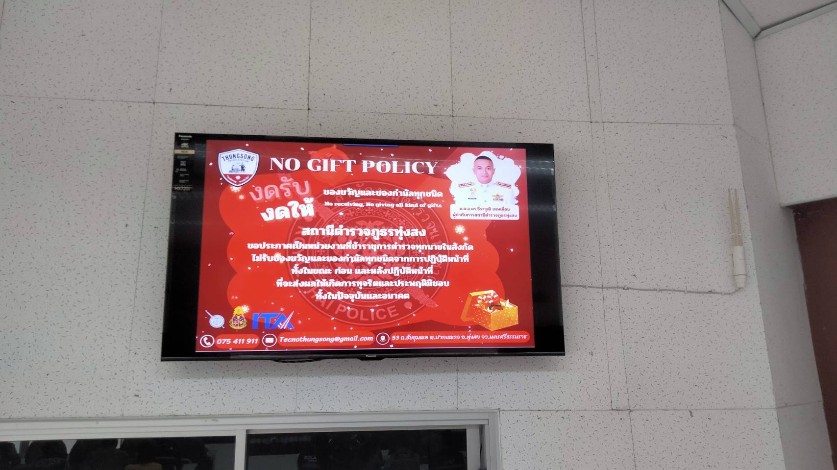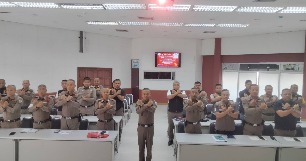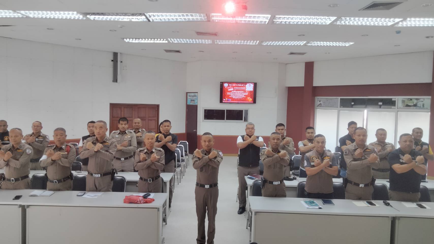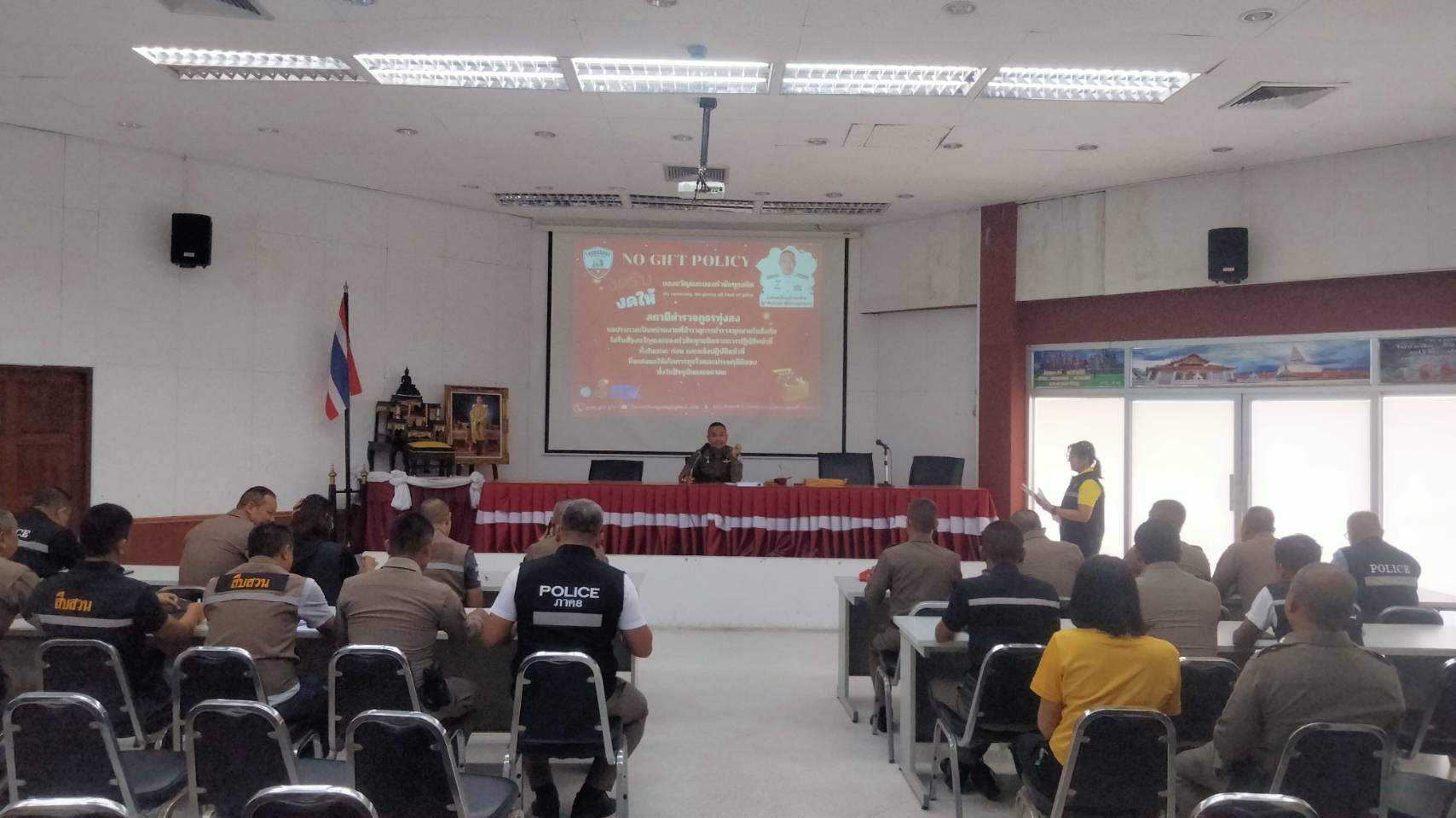 พ.ต.อ.ดร.ธีระวุฒิ เทพเลื่อน ผกก.สภ.ทุ่งสง พร้อมข้าราชการตำรวจ สภ.ทุ่งสง ร่วมกันประกาศนโยบายไม่รับของขวัญและของกำนัลทุกชนิด No gift Policy