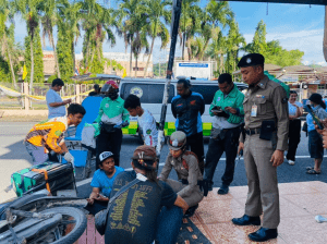 ร.ต.อ.หญิง กาญจนา ธนาวุฒิ รอง สว.(สอบสวน) ให้การช่วยเหลือแก่ประชาชนระหว่างออกตรวจที่เกิดเหตุรถเฉี่ยวชน