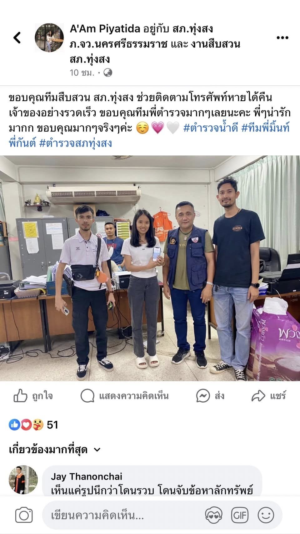 เจ้าหน้าตำรวจสืบสวนทุ่งสง ติดตามโทรศัพท์หาย ได้อย่างเร็วรวด จนได้รับคำชมเชย